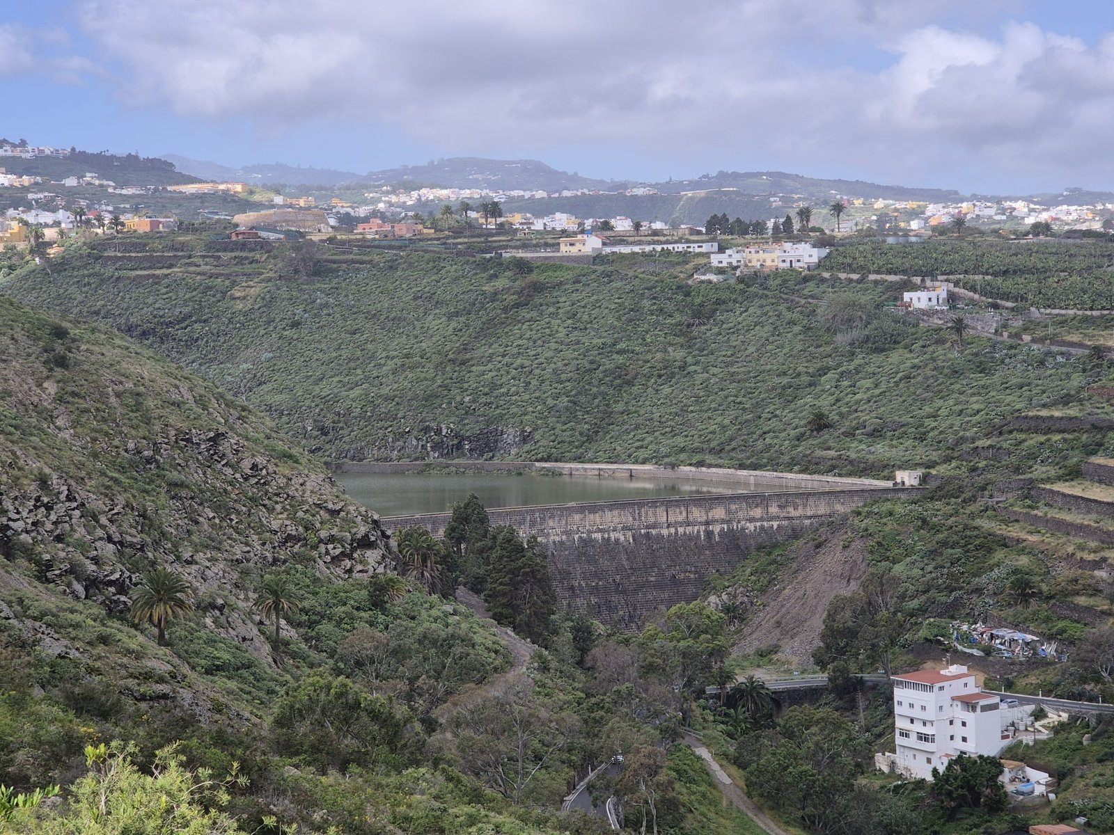 Empezamos a caminar en el aparcamiento que se encuentra junto al Paseo Poeta Pedro Lezcano. Avanzamos por este hacia el norte y en la primera rotonda que encontramos tomamos a la derecha la Calle Dr. Fernando Caubín Ponce. En el siguiente cruce subimos por la izquierda hasta encontrar el Parque de las Flores. Caminamos hacia la derecha hasta el final de éste y tomamos la Calle Acequia Alta. Al encontrar por la izquierda unos lavaderos tomamos el Camino hasta llegar a la GC-330 (Arucas-Bañaderos) junto al Árbol Bonito. Continuamos por esta carretera hasta encontrar por la izquierda la pista Las Hoyas por la que nos adentramos. En unos metros encontramos por la izquierda el Camino del Buen Suceso, que más adelante pasa a llamarse Camino del Caidero y finalmente Maestro José Ganzález, que nos llevará hasta la GC-300 (Carretera Arucas-Moya). Continuamos por la carretera en dirección a Moya y después de un Km aproximadamente llegamos a una parada de Guaguas. Frente a esta comienza a ascender el sendero que nos lleva a la parte alta de la Presa de los Palmitos, pudiéndose ver a la cola de esta la Presa de la Vistilla. Continuamos hacia la izquierda, pasamos por delante de al Cantería de Arucas y continuamos hacia Las Presas de Pinto en el Barranco de Bañaderos.